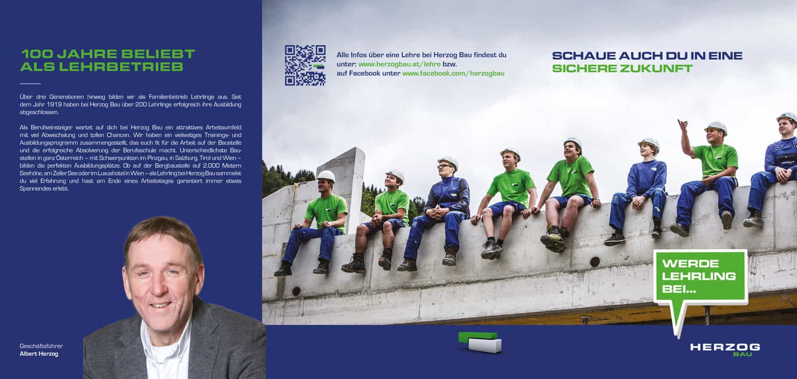 Mittels einer eigenen Unterseite auf der Herzog Bau Website können sich an einer Lehre interessierte Schüler und auch deren Eltern informieren und direkt Kontakt zu unserem Team herstellen. www.herzogbau.at/lehre/
